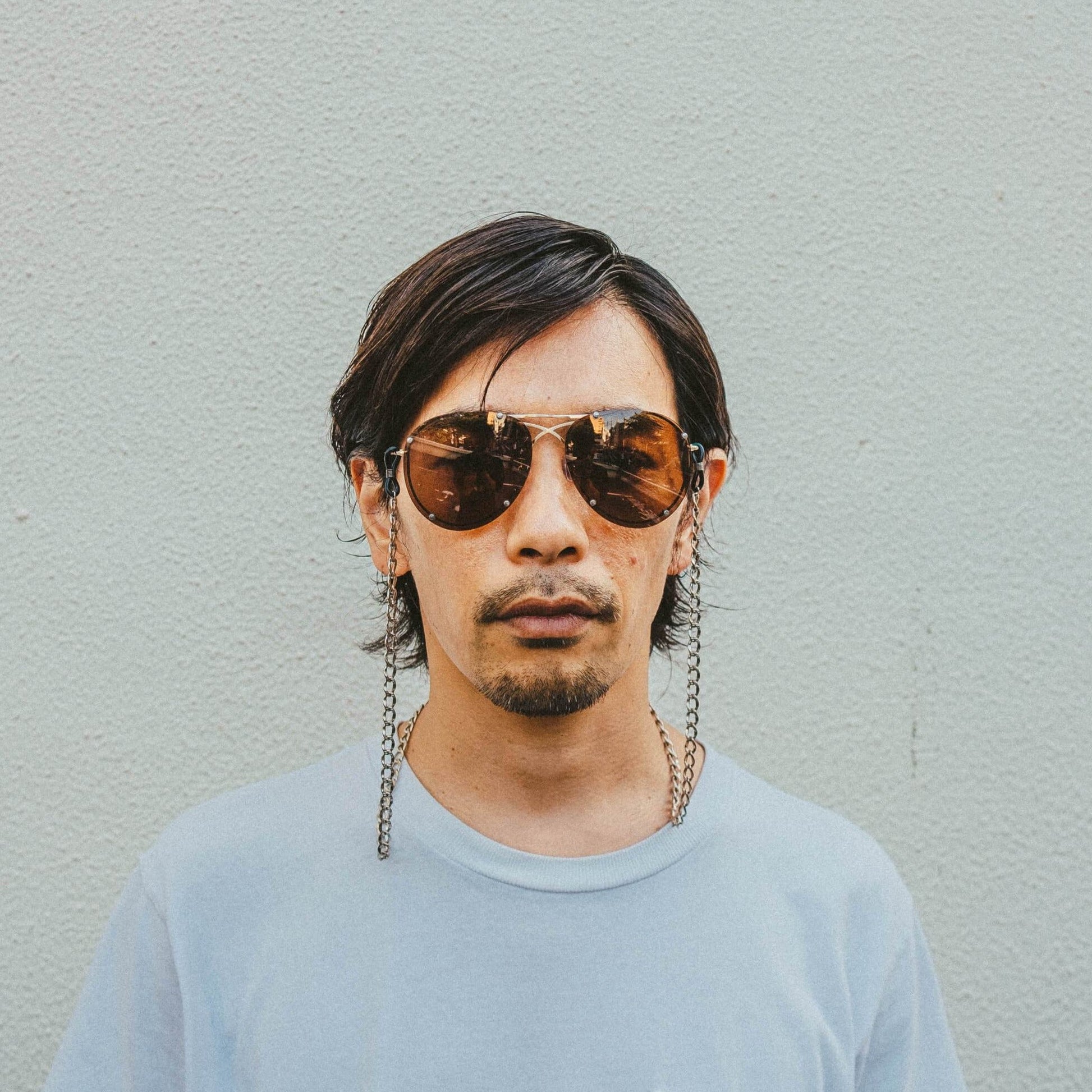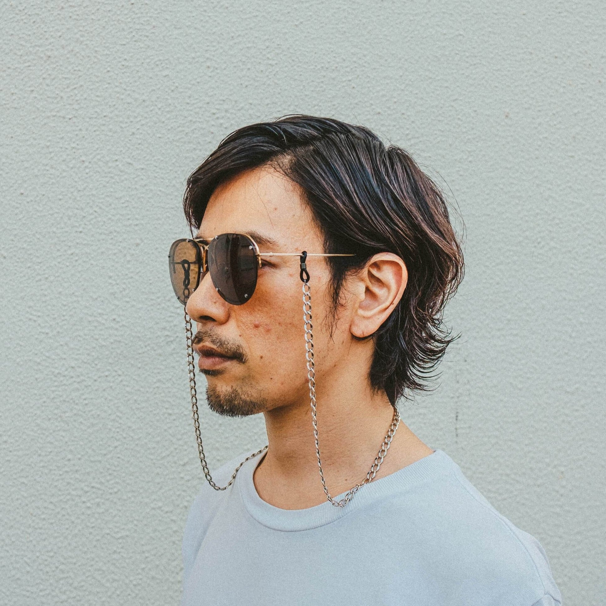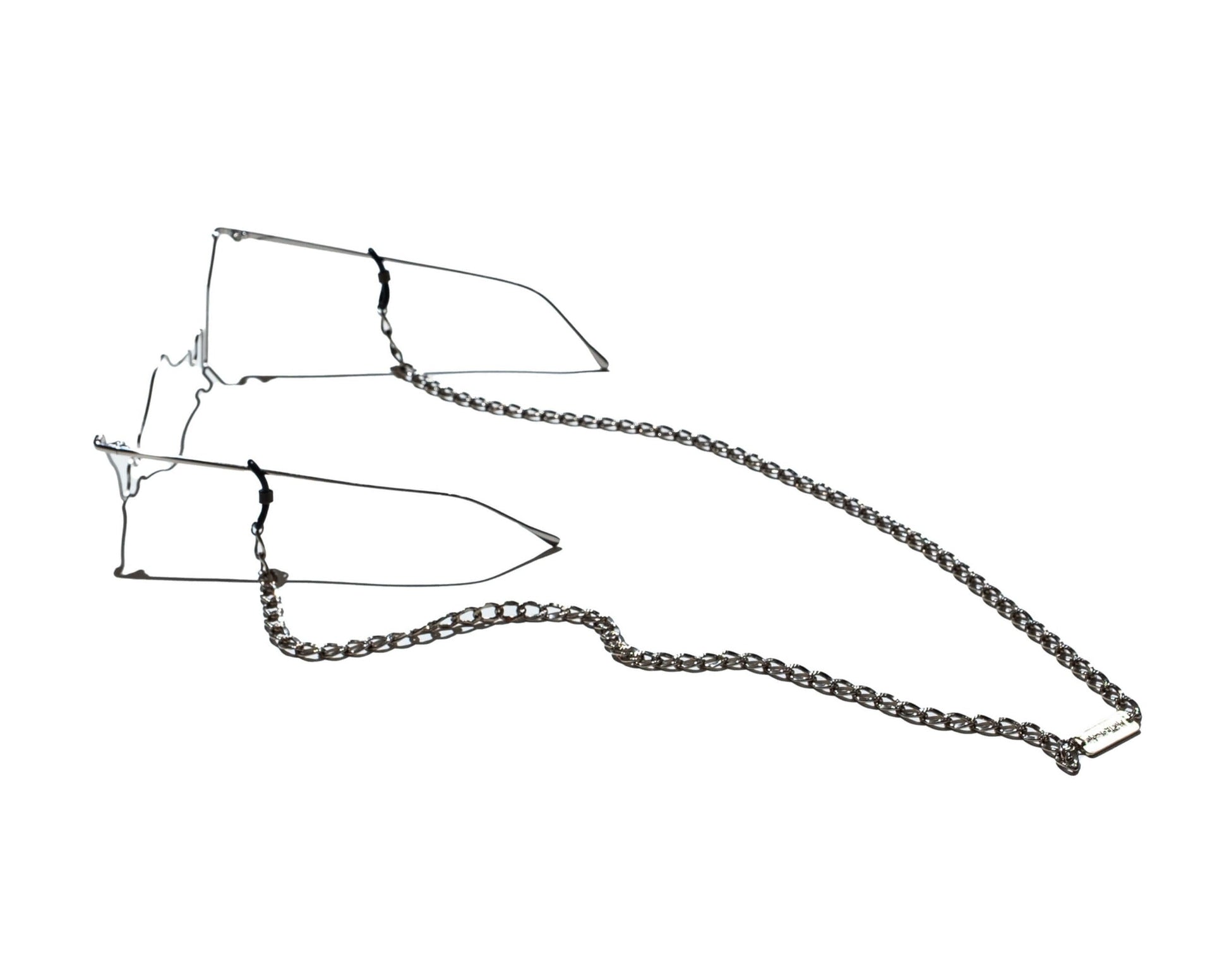 中振りのチェーンを採用、メガネのメッキと同じ様に表面処理を施し、合金素材ではありますが、色落ちに対する耐久性、アレルギーにも対策をしています。